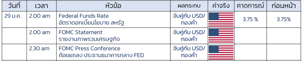 Day วานนี้ ราคาปิดบวก $171.5 สร้าง ATH 5190 แต่ยังคงเดินหน้าไปเรื่อยๆ ปัจจุบันพุ่งแต่ 5239 แรงหนุนดังกล่าว มาจาก การอ่อนค่าอย่างหนักของ USD หลัง ทรัมป์ ออกมาให้ความคิดเห็น การขึ้นลงของ ดอลลาร์ ก็เหมือน Yo-Yo ยินดีที่ยอมรับการอ่อนค่าของ USD เพื่อกดดันให้ ดอกเบี้ยต่ำลง (เฟดอาจไม่ปรับลดดอกเบี้ยในการประชุม Fed วันนี้) และทำให้สงออกดีขึ้น ส่งผลให้ USD ปรับตัวร่วงลงทันที แตะระดับต่ำสุดตั้งแต่ ต.ค.2022 นอกจากนี้ยังมีปัจจัยบวกจากความตึงเครียดทาง ภูมิรัฐศาสตร์ ระหว่าง สหรัฐ – อิหร่าน จับตา 24 ชั่วโมงหลังจากนี้ กองทัพสหรัฐ – อิหร่าน ต่างฝ่ายต่างประจำกอบทัพทางยุทธศาสตร์ /นอกจากนี้ยังคงมี ปัจจัยความไม่แน่นอนทางการค้า หลัง สหัฐ เตือน จะมีแผนเรียกเก็บภาษี เกาหลีใต้จากเดิม 15% เพื่อแลกกับการที่เกาหลีใต้ต้องมาลงทุนในสหรัฐ เป็น 25% / โอกาสจะกลับมาของ Government Shutdown เนื่องจากจนถึงปัจจุบันยังคงไม่สามารถ ผ่านมติ งบประมาณ ปี 2026 ได้ ,กำหนด เส้นตาย ต้องตกลงในวันที่ 30 ม.ค.
