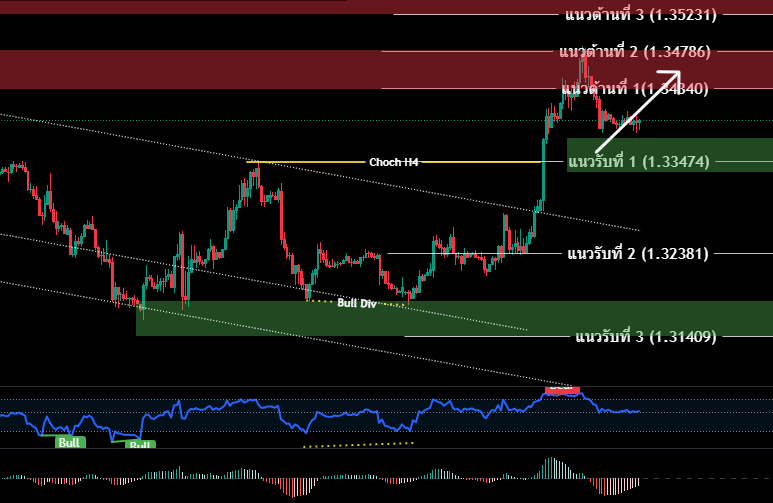 H4/H1 สิ้นสุดโครงสร้างเทรนด์ขาลงระยะสั้น GBP ยืนเหนือ CHoch H4 @1.33474 เข้าสู่แนวต้านสำคัญ ราคาเริ่มเข้าสู่ Overbought zone ระวังแรงขายทำกำไร เน้นการย่อซื้อจึงจะปลอดภัยกว่า