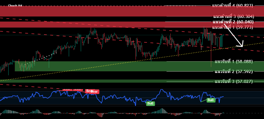 H4/H1 โครงสร้าง H4 ยังคงเป็นขาลง โดยมีจุด choch H4 (เปลี่ยนโครงสร้าง) ที่ 59.750 ซึ่งตรงกับแนวต้าน Channal Downtrend H4 เช่นกัน / ราคาปรับตัวขึ้นลง อยู่ในกรอบ 58.088 – 59.498 (ตามคาด)