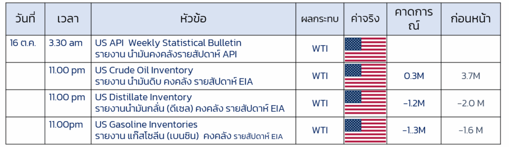 - API Weekly Report น้ำมันดิบ (Crude): +2.780 ล้านบาร์เรล / น้ำมันเบนซิน (Gasoline): –1.245 ล้านบาร์เรล และ น้ำมันดีเซล / น้ำมันหมวด Distillates: –1.822 ล้านบาร์เรล สะท้อนความต้องการใช้น้ำมันภายในประเทศยังคงมีอยู่ แตปริมาณนำ้มันดิบคงคลังยังคงเหลืออยู่ ปัจจัยกดดันราคาน้ำมัน