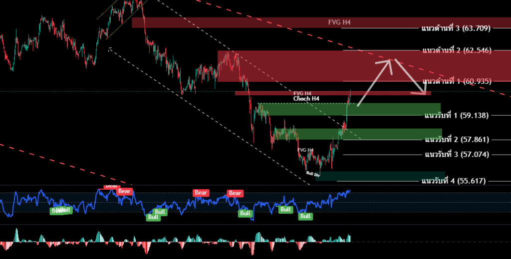 H4/H1 ราคาน้ำมันยืนเหนือ59.749 ซึ่งเป็นจุดสิ้นสุดโครงสร้างขาลง CHOCH H4 ได้สำเร็จ เปิด gab ขึ้นมาในเช้านี้ หลังปัจจัยบวกน้ำมันเริ่มกลับมา