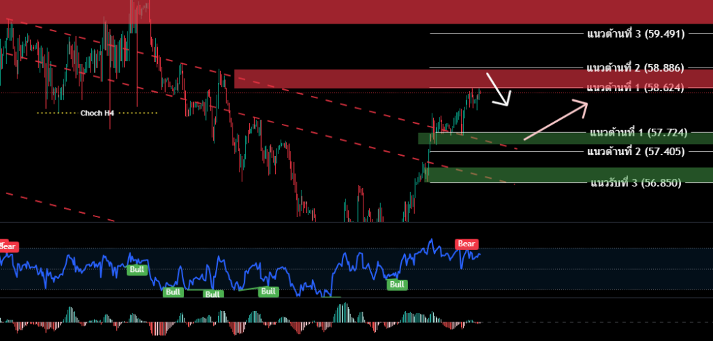 H4/H1 สิ้นสุดโครงสร้างเทรนด์ขาลง ราคาน้ำมันสามารถยืนเหนือ จุด Choch H4 @56.458 และพยายามเบรคทะลุ Channel Downtrend แต่เริ่มปรากฎสัญญาณ Bearish Divergence ระวังแรงเทขายทำกำไร