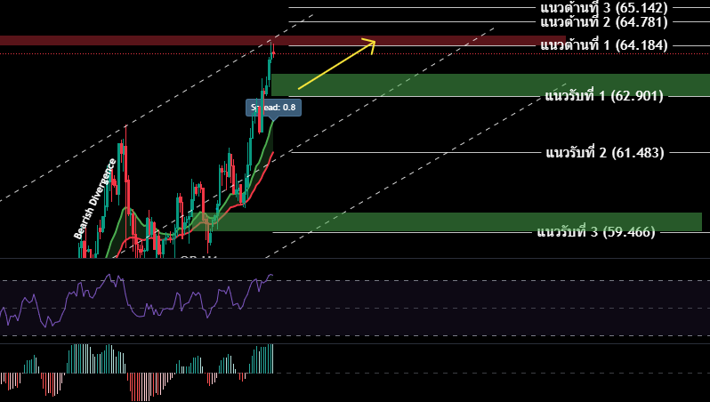 - เปิดสถานะซื้อ (รอสัญญาณซื้อ) กรอบ 62.897-63.474 / SL 62.300 เพือ่ทำกำไร 63.620/63673/63.761/63.823/63.62/64.087