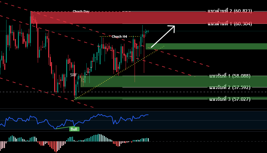 - เปิดสถานะซื้อ (รอสัญญาณซื้อ) กรอบ 59.195-59.480 / SL 59.000 เพือทำกำไร 59.614/593679/59.790/59.977/60.041/60.196
