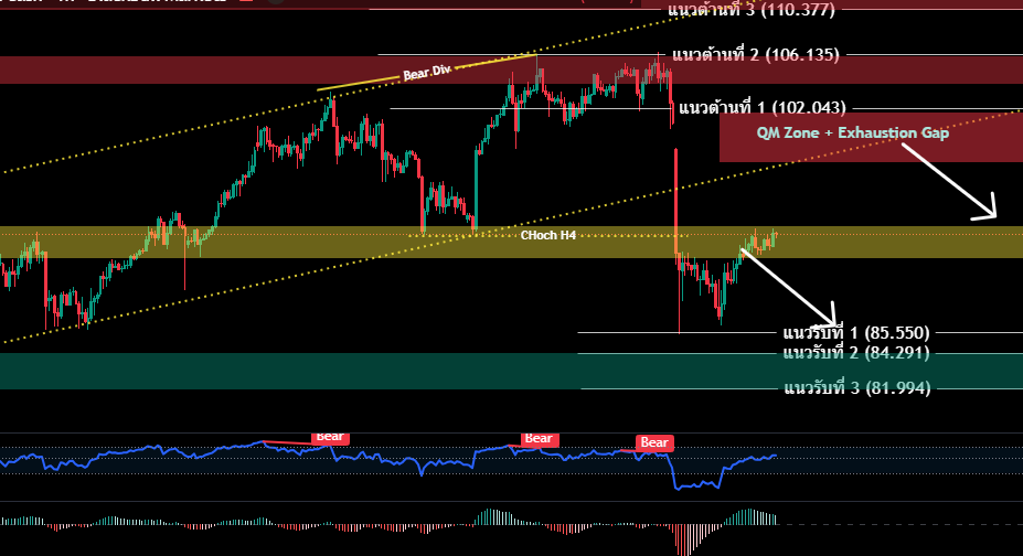 H4/H1 วานนีราคาน้ำมันยังคงเคลื่อนไหวในกรอบแคบ และไม่สามารถยืนเหนือแนวต้าน 106.135 ขึ้นไปได้ราคาปรับร่วงลง (ตามคาด) แต่แรงขายในเช้านี้ หลังทรัมป์ประกาศเลื่อนการโจมตีอิหร่านเป็นอีก 10 วันข้างหน้า เพื่อให้อิหร่านเปิดช่องแคบฮอร์มุช และเข้าสู่การเจรจาในวันศุกร์นี้ ราคาน้ำมันร่วงลงจาก Channel Uptrend และทะลุผ่านจุด Choch H4 ที่ 92.423 ซึ่งเป็นจุดสิ้นสุดโครงสร้างเทรนด์ขาขึ้นในระยะสั้น ราคาร่วงลงสุ่แนวรับ 85.550 ก่อนจะ rebound ขึ้นไปตามสัญญาณ Over Sold H1