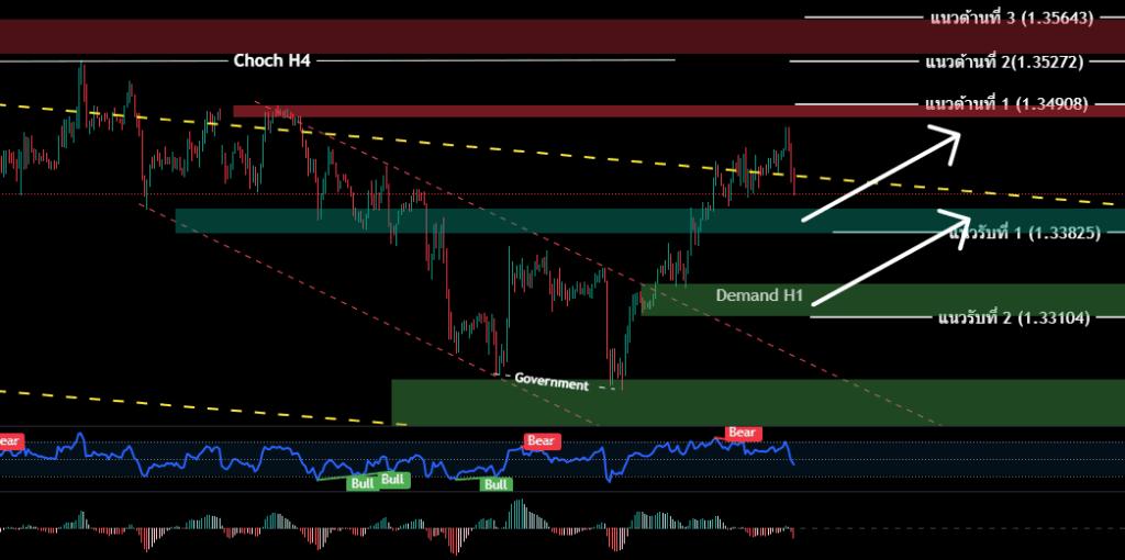 H4/H1 โครงสร้างเป็นเทรนด์ขาลง หากสามารถยืนเหนือ 1.35272 ขึ้นไปได้ จะถือว่าสิ้นสุดโครงสร้างเทรนด์ขาลง ณ ปัจจุบันราคา เบรคทะลุ Channel Downtrend ขึ้นไปเล็กน้อย