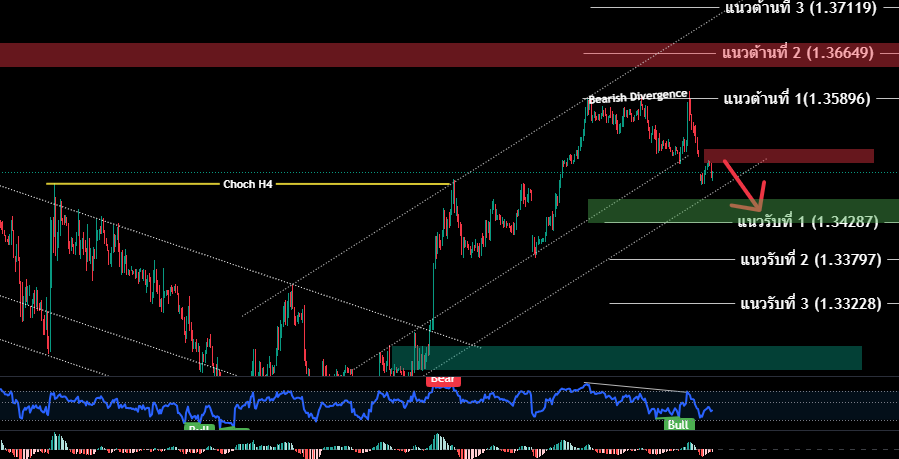 H4/H1 H4 สิ้นสุดโครงสร้างเทรนด์ขาลงระยะสั้น GBP ยืนเหนือ CHoch H4 @1.33474 ได้สำเร็จ รอการย่อตัวใหญ่ เพื่อปรับฐานการขึ้นต่อ ขณะที่ H1 ราคาดีดตัวขึ้นระดับ แนวรับ 1.35896 เริ่มปรากฎ สัญญาณการย่อตัว Bearish Divergence H4 ระวังแรงขาย