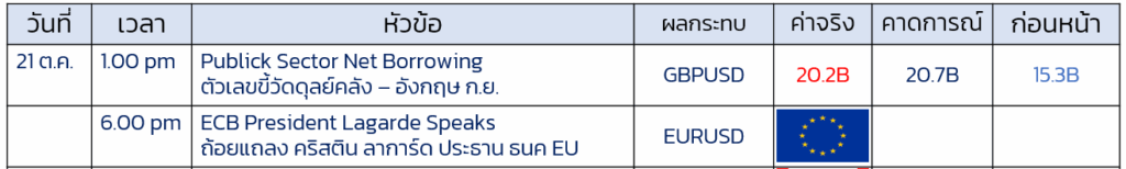 - 21 ต.ค. ประกาศ PSNB ตัวเลขชี้วัดทางการคลังอังกฤา พบ จำนวนเงินรัฐกู้เพิ่มในเดือน ก.ย. 20.7 ล้านปอนด์ สูงจากเดือนส.ค.15.3 ล้านปอนด์ ซึ่งอยู่ในสภาวะขาดดุลย์