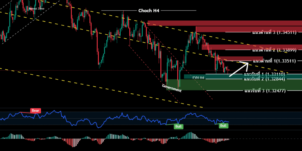 H4/H1 ราคา GBP ยังคงเคลื่อนไหวในเทรนด์ ขาลงอย่างขัดเจน ใน Channel Downtrend ราคากลับลงมาทดสอบบริเวณแนวรับ 1.33110-1.32844 ที่ให้ไว้ ราคาปรับตัวขึ้นเล็กน้อยหลังประกาศตัวเลข PMI ภาคการผลิตออกมาดีเกินคาด เริ่มปรากฎสัญญาณ Rebound ฺฺBullish Divergence