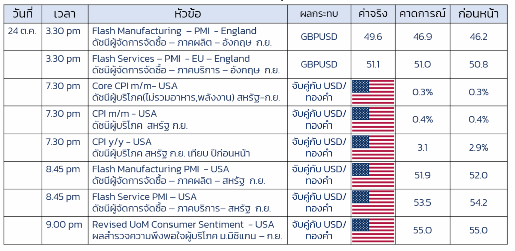 – น้อยกว่า 2.9 % คาดเงินเฟ้อควบคุมได้แต่ยังคงมีปัญหาเรื่องแรงงาน โอกาสที่ Fed จะปรับลดอัตราดอกเบี้ยในวันที่ 28-29 ต.ค. สูง กดดัน USD ปัจจัยบวกต่อ GBP - ติดตามตัวเลข PMI คาดการณ์ว่าออกมาน้อยกว่าเดือนที่ผานมา หากเป็นไปตามคาด จะเป็นปัจจัยกดดันราคา USD ปัจจัยบวกต่อ GBP แต่หากตัวเลขออมากมากกว่าเดือนที่ผานมา จะเป็นปัจจัยบวกต่อ USD และกดดัน GBP