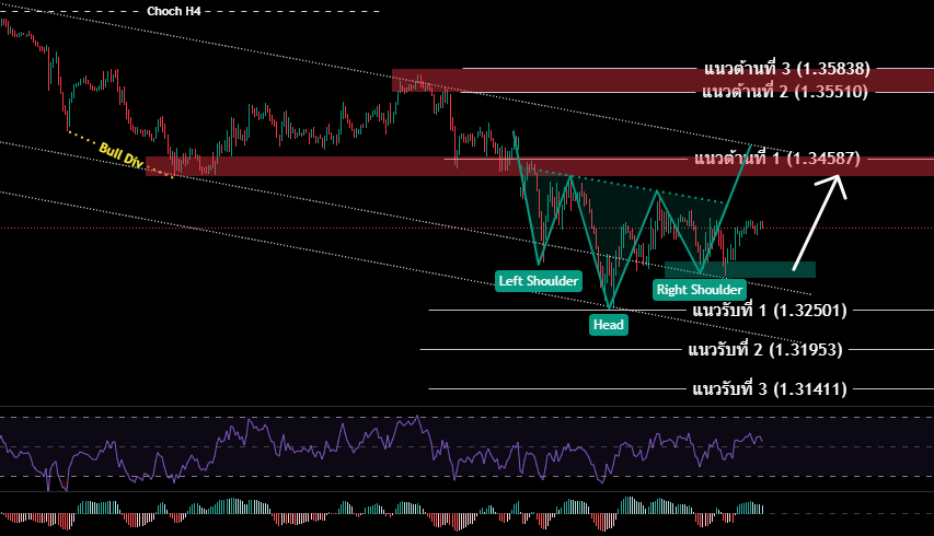 H4/H1 ราคาGBP ยังคงเป็นเทรนดขาลงอย่างต่อเนื่อง ราคามีการ Rebound หลังจากมี สัญญาณ Overbought เริ่มปรากฎ Price Pattern inverse Head and Shoulder