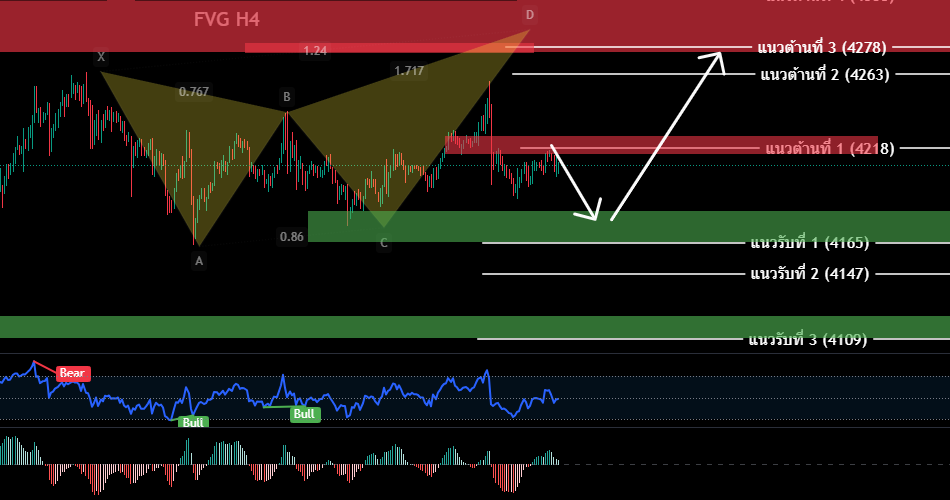H4/H1ทางเทคนิค หลังจากที่ราคา ยังคงเคลื่อนไหวในกรอบ Sideway 4263-4168 ตั้งแต่วันจันทร์ 1 ธ.ค ยังคงไม่เลือกข้าง เน้นทำกำไรในกรอบระยะสั้น ปรากฎภาพ Butterfly Hamonic H4 มีโอกาสที่ราคาขึ้นไปทดสอบ แนวรับที่ 4278 ก่อนปรับตัวยย่อลง แต่เริ่มมปรากฎ Head and Shoulder H1 เช่นกันดังนั้นการลงมาในระดับแรก ต้องเหนือ แนวรับ 4165 จึงจะมีโอกาสขึ้นกลับไปอีกครั้ง