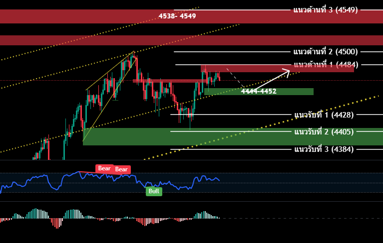- เปิดสถานะซื้อ (รอสัญญาณซื้อ) กรอบ 4444-4452/ SL4435 เพื่อทำกำไร 4459/4463/4466/4469/4474/4478