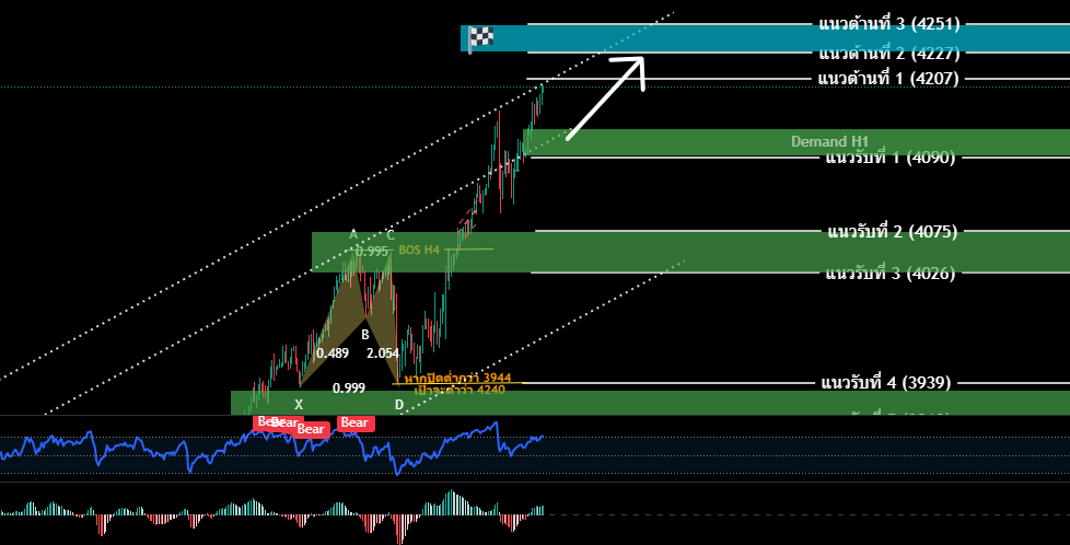 H4/H1 ทางเทคนิค วานนี้ราคาทองคำย่อตัวลงในช่วงเช้า การทำกำไรทางเทคนิค เพื่อเคลียร์ สัญญาณ Bearish Divergence H4 ราคา ย่อลงมาแตะระดับ $4090 แต่ยังถือว่ายังไม่จบ Impulse และยังไม่มีการพัฐานใหญ่ แต่ขณะเดียวกัน ก็มีโอกาสขึ้นไปทดสอบ 4227 – 4251 ซึ่งเป็นระดับ Extension 261 – 300% แนะนำเปิดสถานะขือ้ ทำกำไรระยะสั้น มี SL ที่การซื้อขาย ระวังแรงเทขาย หาก สถานะการณ์ สามารถกลับมา เปิดทำการได้ตามปรกติ และระวังแรงเทขายทำกำไรระยะสั้นจาก Bearish Divergence H1