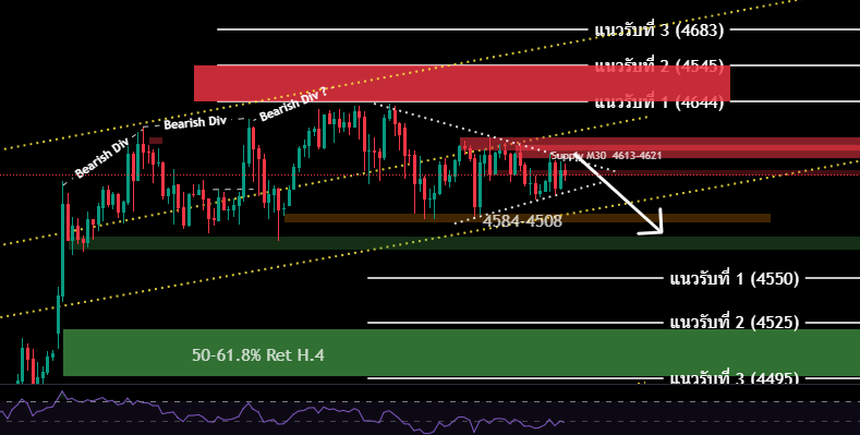 H4/H1ราคาทองคำเป็นเทรนด์ขาขึ้น และมีการเคลื่อนไหวตามเป้า แตะ บริเวณ 4644 (ตาม Harmonic Butterfly + Retracement 261.8% เรียบร้อยแล้ว) เริ่มปรากฎสัญญาณการย่อตัว Tripple Bearish Divergence H1 + Bearish Divergence H4 เริ่มมีการฟอร์มกำลัง ในรูป 3 เหลี่ยม ระวังการย่อตัวปรับฐานใหญ่