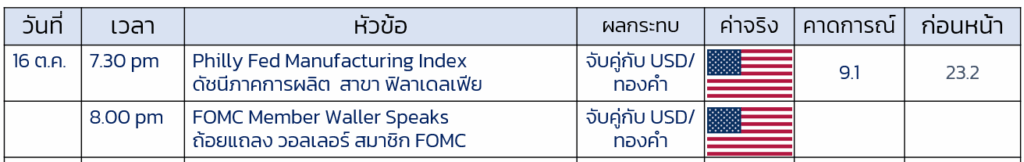 - ติดตาม ดัชนีภาคการผลิตสาขา ฟลาเดลเฟีย หากตัวเลขออกมา สุงกว่าเดือน ก่อนหน้า 23.2 จะมีผลกดัน ราคาทองคำ (เล็กน้อย)