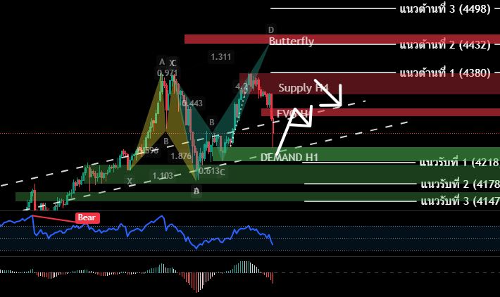H4/H1 ราคาปรับตัวร่วงลงมาทันทีขึ้นไปทดสอบแนวต้าน 4355-4380 ประกอบแรงขายทางเทคนิค Bearish Divergence H4 ซึง ณ ปัจจุบันยังคงไม่ลงมาเคลียร์สัญญาณครบ ดังนั้นหากราคาปิดตำกว่า 4187 มุมมอง Harmonic Butterfly ที่เป้า 4432 จะเปลี่ยนไปเป็นการย่อลงลึกปรับฐานใหญ่