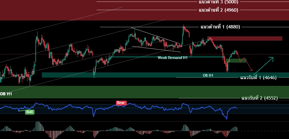 H4/H1 โครงสร้างระยะสั้น H4 ยังคงเคลื่อนไหวในเทรนด์ขาลง H1 เคลื่อนไหวในรูปแบบ Sideway Up แม้ว่าจะมีการดีดขึ้นหลังสร้าง Raising Wadge Pttn แต่ ยังคงไม่สามารถยืนเหนือจุด 4872 ขึ้นไปได้ ราคาปรับตัวลงและคาดออกข้างเพื่อสะสมกำลัง และมีการเบรคแนว Demand H1 (Weak Demand) ร่วงลงมา กรอบแนวรับ OB H1 มีแรงซื้อกลับทางเทคนิค Oversold