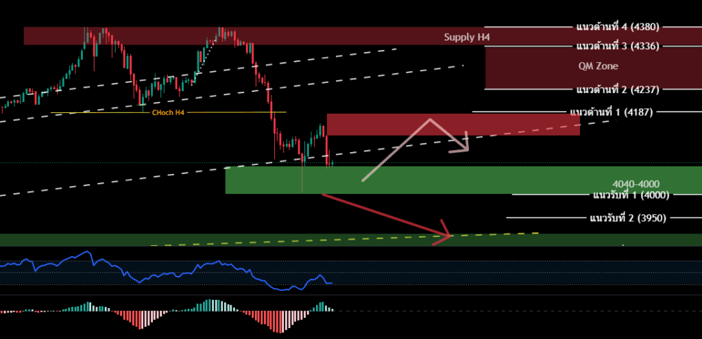 H4/H1 ทั้ง H1-H4 สิ้นสุดโครงสร้างเทรนด์ขาขึ้นราคาปิดต่ำกว่า จุด Choch ที่ 4187 ลงมา แนวรับที่ 4000-4040 เป็นแนวรับที่ยืนยันว่าการร่วงปรับฐานจบลงหรือไม่