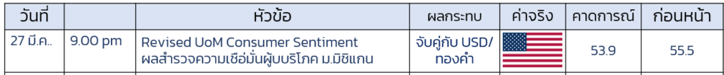 - ติดตามตัวเลขผลสำรวจความเชื่อมั่นผูบริโภค สหรัฐ หากออกมาต่ำกว่าคาดการณ์ จะส่งผลกดดัน USD และเป็นปัจจัยบต่อทองคำระยะสั้น