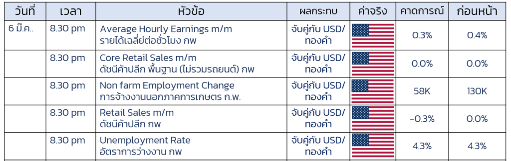 - ติดตามตัวเลขการจ้างงานนอกภาคการเกษตรสหรัฐ หากตัวเลขออกมาน้อยหรือเท่ากับคาดการณ์ จะเป็นบวกต่อราคาทองคำ ยิ่งหากอัตราการว่างงาน ออกมามากกว่า 4.3% จะยิ่งเป็นบวกต่อราคาทองคำมาขึ้นเช่นกัน แต่หากตัวเลขใกล้เคียงกับเดือนที่ผ่านมาทองคำมีโอกาสถูกกดดันลงต่อ