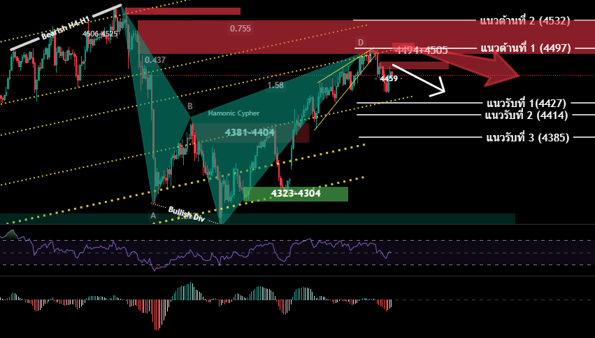 H4/H1 เช้าวันนี้้ราคาทองปรับตัวร่วง บริเณแนวต้านที่ให้ไหว้ (ตามคาด) ราคาทองคำใน H4 โครงสร้างเป็น Sideway กรอบใหญ่ ทองดีดขึ้นมาตามภาพของ Inverse Head and Shoulder + Hamonic Cypher เรียบร้อยแล้ว มีโอกาสที่จะลงมาทำเป้าหมายที่ 38.2 – 61.8 ในระดับ 4430- 4385 ใน TF M30 หากราคาไม่ลงมาก่อนที่ 4459 มีโอกาสกลับขึ้นไปทำ Hamonic Bat ที่ 4494 -4505 แต่หากราคาหลุดต่ำลงมา 4459 แล้ว เป้าต่อไป จะไป 4430