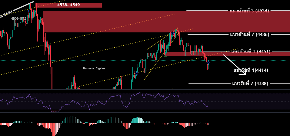 Day วานนี้ ราคาปิดลบ $39 ราคามีแรงเทขายทางเทคนิคหลังจากขึ้นไปแตะบริเวณแนวต้าน 4497-4532 ประกอบกับ สามเหลี่ยม Triangle ลักษณะ Failing Wedge ราคารปับร่วงลงมาแตะแนวรับที่4430 (ตามคาด) ทั้งนี้ในช่วงคำที่ผ่านมา ตลาดมีความผันผวนจากข้อมูลตัวเลขเศรษฐกิจสหรัฐทั้งในเชิงบวก และลบ