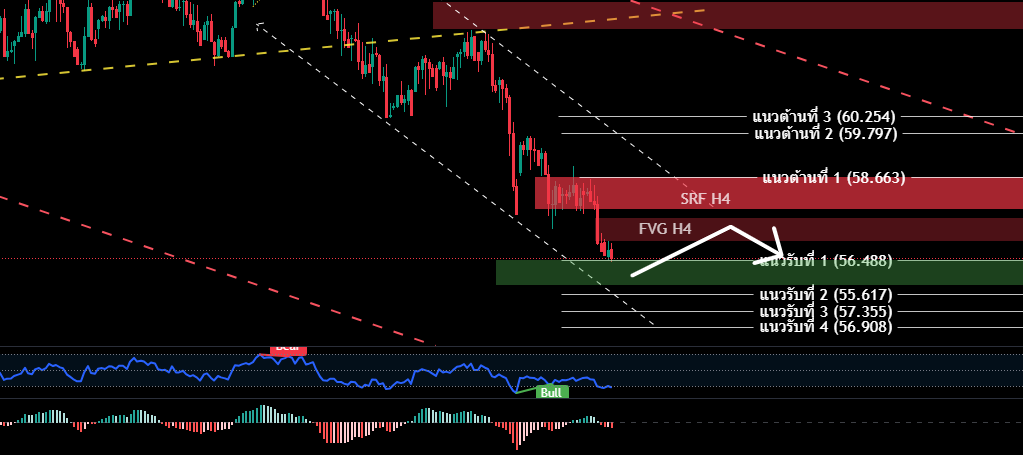 H4/H1 เคลื่อนที่ลงใน channel Downtrend ใน Day และ H4 ราคาหลุดแนวต้าน บริเวณกรอบ 58.841-59.708 ลงมา ่ร่วงถึงระดับ Low ใหม่ 56.488 บริเวรกรอบแนวรับ สำคัญ + ปรากฎสัญาณ Bullish Divergence H4- H1 ระวังการ Rebound ขึ้นของราคา